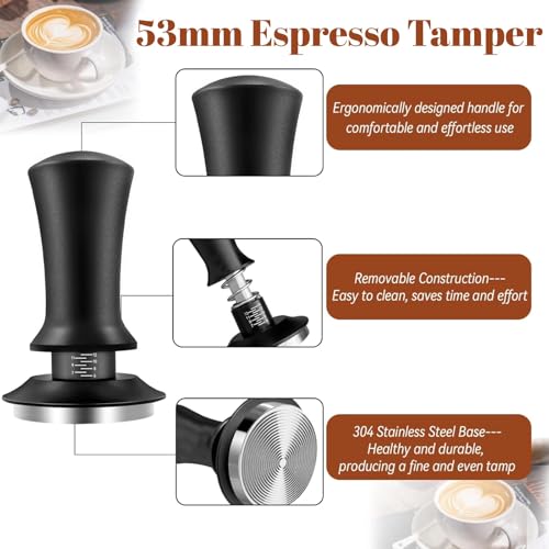 - CONSISTENTLY EXCELLENT QUALITY: 53mm espresso coffee tamper is the cornerstone of our set, embodying precision and quality. Its spring-loaded stainless steel base ensures even distribution of the grounds and maximum extraction, guaranteeing a consistently rich and aromatic espresso every time you brew. Coffee accessories barista is the key to unlocking the full potential of the bean and ensuring a pleasurable sensory experience.