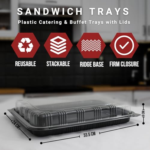 - PACK SIZE: These platters for party food set comes with 6 trays & 6 lids, the dimensions of these sandwich trays with lids are 33.5cm x 24cm x 6cm, making them perfect for big occasions such as Banquets, Weddings, Engagements, Birthdays, Baby Showers, Parties, Catering and Home Cooking